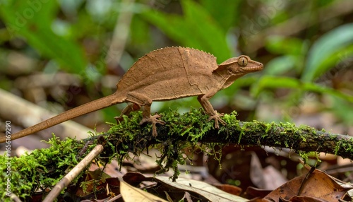 gecko, reptile, camouflage, wildlife, animal, nature, forest, tree branch, moss, macro, closeup, fauna, scale, eye, vertebrate, tropical, timberland, environment, ecology, adaptation, evolution, biodiversity, conservation, outdoors, daylight, portrait, exotic, texture, pattern, brown, green, natural, isolated, specimen, biology, zoology, herpetology, life, still life