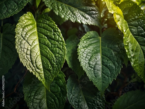 Leafy green background with vibrant textures and sunlight.