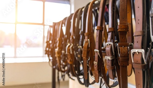 leather, belt, buckle, display, store, brown, hanging, metal, row, sunlight, window, interior, shop, accessory, fashion, retail, tan, dark, light, quality, product, leather goods, horseback, equestrian, closeup, arrangement, dark brown, light brown, soft, hard-wearing, practical, elegant, luxury, high-quality