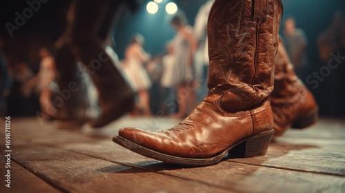 leather cowboy boots on wooden floor with dancers in background country line dance event western style fashion footwear choreography music stage light energy tradition culture social gathering