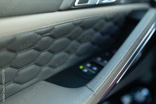 Leather panel with honeycomb line at the door. Modern SUV interior close up and selective focus