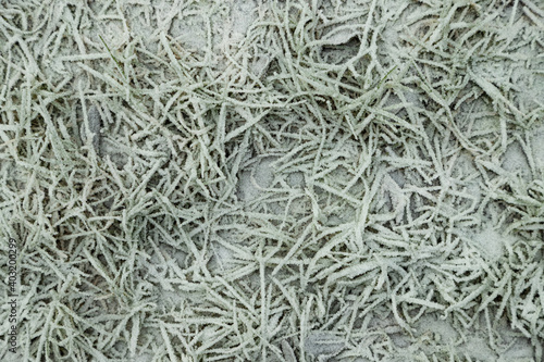 Leaves and grass covered with hoarfrost. Abstract floral background, top view.