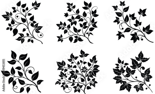 leaf, leaf, vine, black-and-white, vector, illustration, art, set, design, design element, silhouette, black
