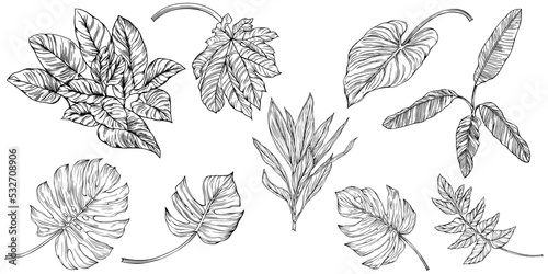 tropical, leaf, floral, leaf, nature, plant, illustration, drawing, vintage, vignetting, decoration, design, spring, art, summer, beauty, black, garden, wallpaper, tree branch, flora, retro, engraving, botanical, outline, element, bouquet, botany, print, hand-drawn, decor, tree, foliage, textile, set, line, isolated