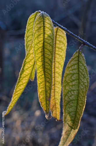 Leaves of a bush covered with frost