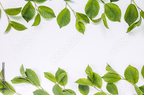 leaves on white background. Pattern made of branches. Flat lay, top view, copy space