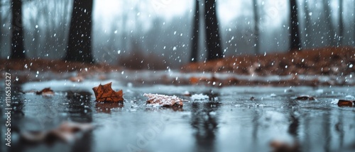 Leaves rest on a wet forest path under a light shower, evoking the serene beauty and transitional mood of an autumn day in quiet solitude.