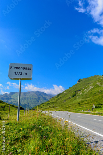 panorama, street, mountain pass, plate, asphalt, austria, vorarlberg, car, summer, time, curve, danger, track, communication, alpen, heaven, blue