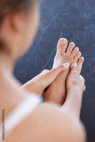 leg. Cropped over the shoulder shot of a ballerina massaging her foot.