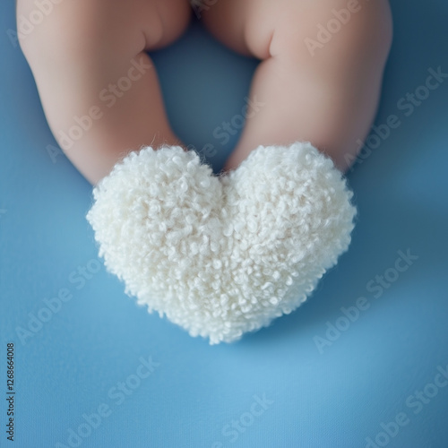 legs newborn baby close up on a blue background with a toy in the form of a heart