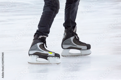 Legs of a man skating on an ice rink. Hobbies and sports. Vacations and winter activities.