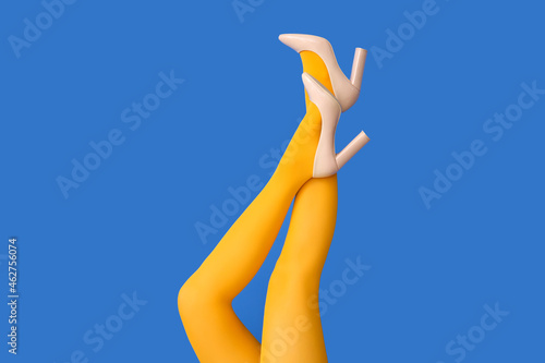 Legs of beautiful young woman in tights and high-heeled shoes on color background