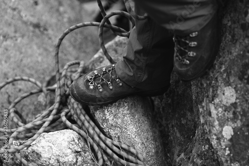 Legs of the climber in climbing boots against the backdrop of climbing rope. Black and white.
