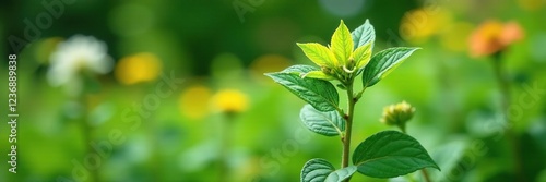 Lemon balm plant in a garden with other plants, flower, leaves, lemon balm