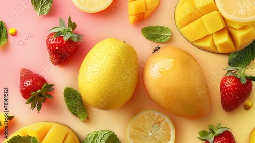 lemon, pineapple, strawberry top view, summer background, international fruits day