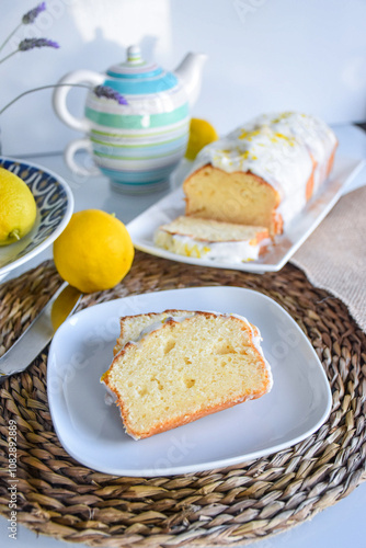 lemon sponge cake glazed in a kitchen with a neutral homemade background