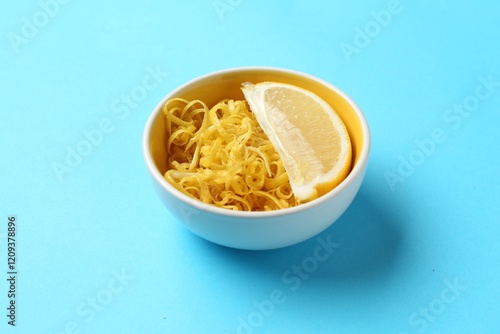 Lemon zest and piece of fresh fruit on light blue background, closeup