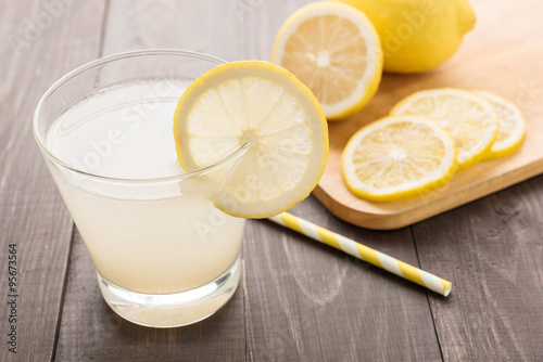 lemonade with fresh slice lemon on wooden table