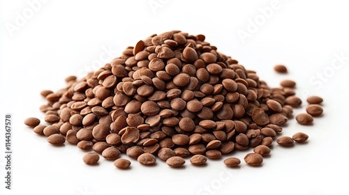 Lentils: A heap of dried brown lentils with a smooth surface and small, round shape, isolated on a white background.
