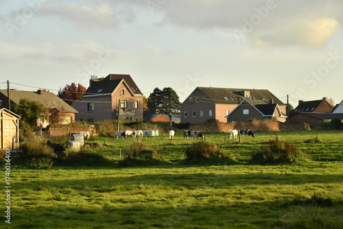 Les maisons et fermes derrière une prairie sous la lumière du coucher de soleil à Ghislenghien (Ath)