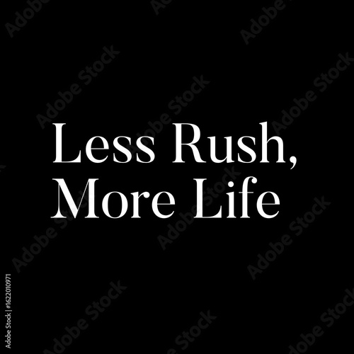 Less rush, More life. Slow living minimalism quote. White minimal text on black background for prints, posters, wall art.