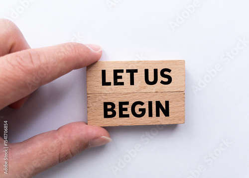 Let us begin message written on wooden blocks on white background. Conceptual let us begin symbol. Copy space.