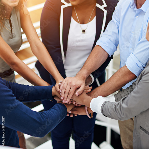 Lets do this team. Shot of a group of coworkers standing with their hands together in a huddle in an office.