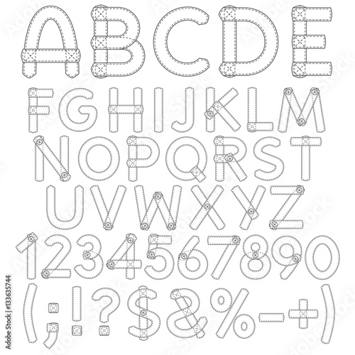 alphabet, clothes, letter, number, symbol, vector, thread, stitch, sew, isolated, rudiments, object, buttons, typographic, white background, set, text, font, sewn, contour, textile, black-and-white, print, imprint, latin, signs, design, graphic, tailor, flat, hand-made, on white, sewing, handcraft, fabric, simple, shape, outline, seam, dotted line, machine, dressmaker, form