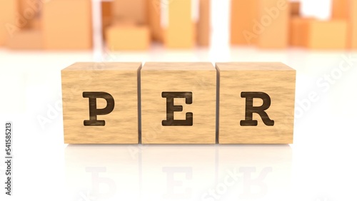 Letters PER branded on wooden blocks reflected on the beautiful table. Business concept. In the back are wooden cuboids in various shapes. (3D rendering)
