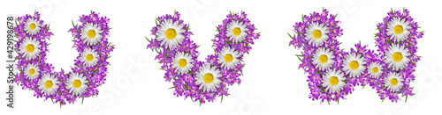 Letters U, V, W made of lilac violets and chamomile