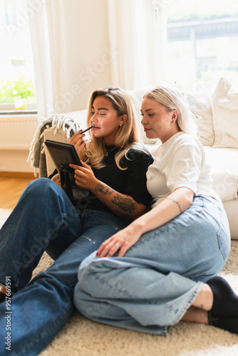 acceptance, affection, authentic, beauty, blond, bonding, care, casual attire, companionship, connection, cosmetic, couple, cosy, domestic, everyday, gay, girlfriend, happy, heartwarming, home, inclusive, indoor, intimacy, joy, lesbian, life, lifestyle, lipstick, living room, love, make-up, mirror, modern, quality time, human relationships, relaxation, routine, rug, serenity, skin, sofa, support, tattoo, together, togetherness, calmness, woman, young