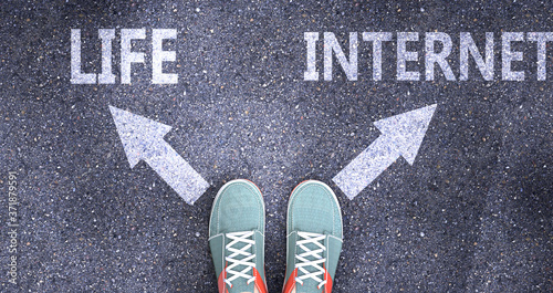 Life and internet as different choices in life - pictured as words Life, internet on a road to symbolize making decision and picking either Life or internet as an option, 3d illustration