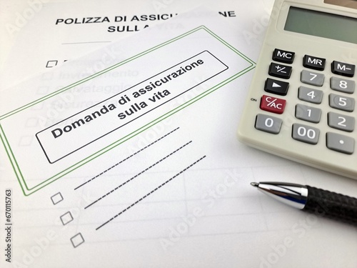 Life Insurance documents. Insurance documents on a desk with calculator and pen.