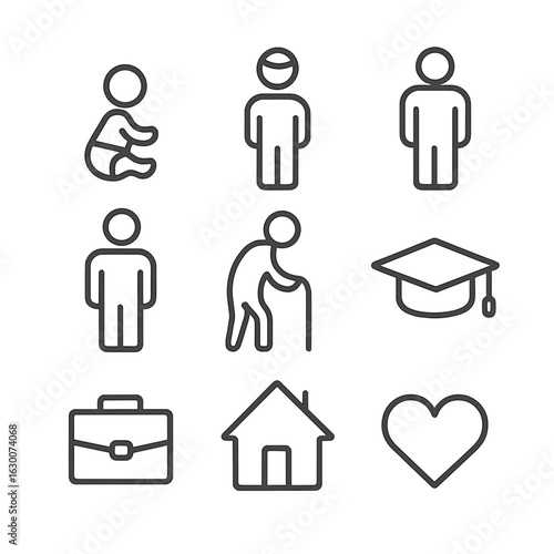 life, stage, icon, outline, icon, set, human, baby, children, teenage, adult, elderly, graduation, cap, briefcase, house, nubes, line, only, black, colours, consistent, stroke, weight, across, all