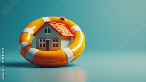 Lifebuoy embracing a small house figurine, concept of emergency protection and home insurance, vivid tones, studio lighting, clear and detailed focus.
