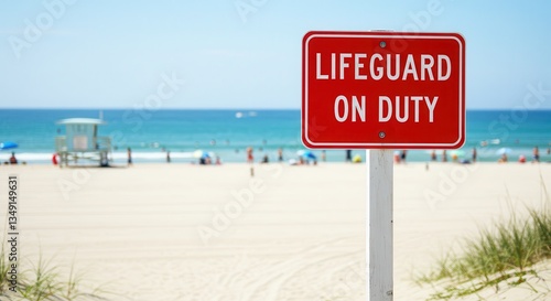 Lifeguard on Duty Sign at Sandy Beach by Ocean on Sunny Day