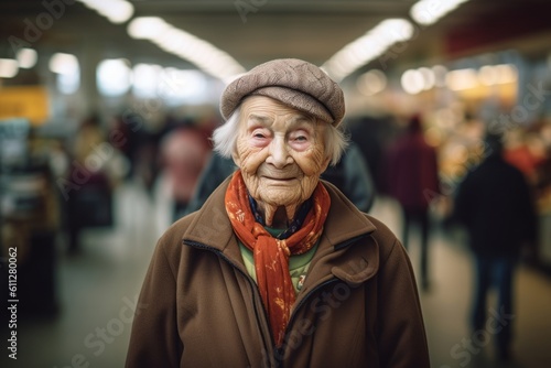 Lifestyle portrait photography of a glad old woman wearing a lightweight windbreaker against a bustling indoor market background. With generative AI technology