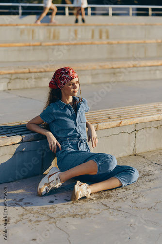 Lifestyle woman wearing modern boho-western denim street style with a red bandana, relaxing in warm sunlight with film color effect and casual confident mood.