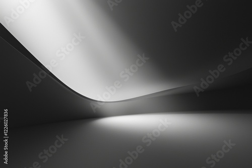 abstract, background, black, white, curve, light, beam, to illuminate, illuminating, space, modern, minimalist, design, empty, blank, simple, elegant, futuristic, architecture, interior, three-dimensional, render, rendering, digital, art, graphic, illustration, wallpaper, template, presentation, clean, smooth, soft, gradient, shadow, contrast, monochrome, greyscale, shape, form, line, wave, flow, dynamic, energy, power, mystery, serene
