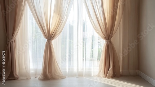 curtain, window, light, beige, sheer, drape, home, interior, design, decor, sunlight, natural, living, room, bedchamber, apartment, modern, simple, elegant, style, warm, soft, fabric, texture, subtile, airy, bright, fresh, peaceful, relaxing, minimalist, dwelling, house, daylight, clean, neutral, view, outside, garden