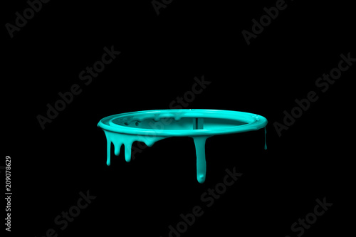 Light Blue paint leaking over the wall of empty metal bucket. Isolated