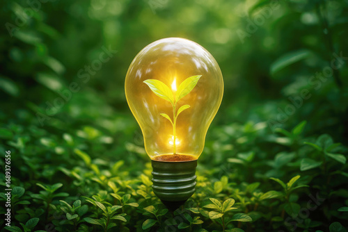 Light Bulb Containing a Sprouting Plant in a Lush Green Forest seedling growth