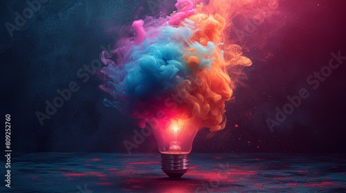 Light bulb with colorful smoke explosion on dark background