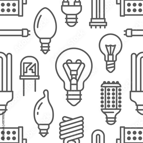 Light bulbs seamless pattern with flat line icons. Led lamps types, fluorescent, filament, halogen, diode and other illumination. Modern black white background with linear signs for electric store.