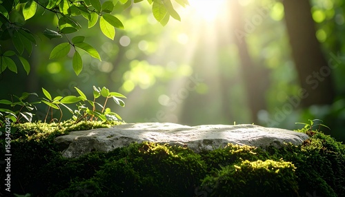 Light filtering through a canopy of leaves casting dappled, organic shadows on a mossy stone surface in muted tones