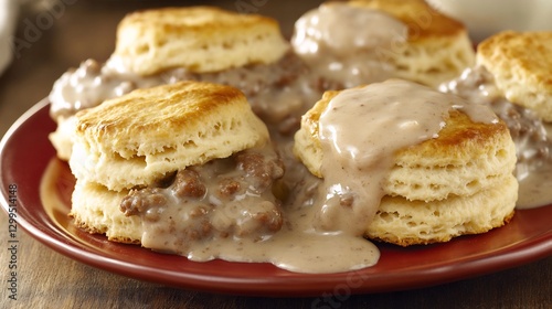 light, fluffy, biscuit, served, sausage, gravy, classic, southern, breakfast, nourishment, food, wellness, health, nutrient, revolutionary, texture, geometric, aesthetic, balanced, capture, serene, industrial, nature, contemporary, abstract design, image, conceptual, trendy, stunning, intricate, modern art, crisp, photorealistic, photo, realistic, software, sophisticated