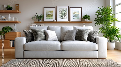 Light Gray Linen Sofa in Modern Studio with Elegant Art and Greenery Accents