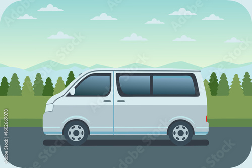 minivan, van, vehicle, car, transportation, travel, road trip, vacation, landscape, nature, mountain, tree, forest, road, scenic, illustration, white, summer, tour tourism, adventure, camping, family, traveler, cartoon, design, light, grey, roadside
