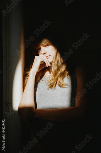 portrait, woman, grey shirt, elegant, film, grain, shadow