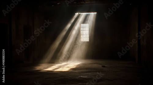 room, sunlight, dark, window, bright, starburst, effect, corner, visible, furniture, object, wall, floor, dirt, concrete, surface, overall, atmosphere, mysterious, dramatic, glow, scene, right side